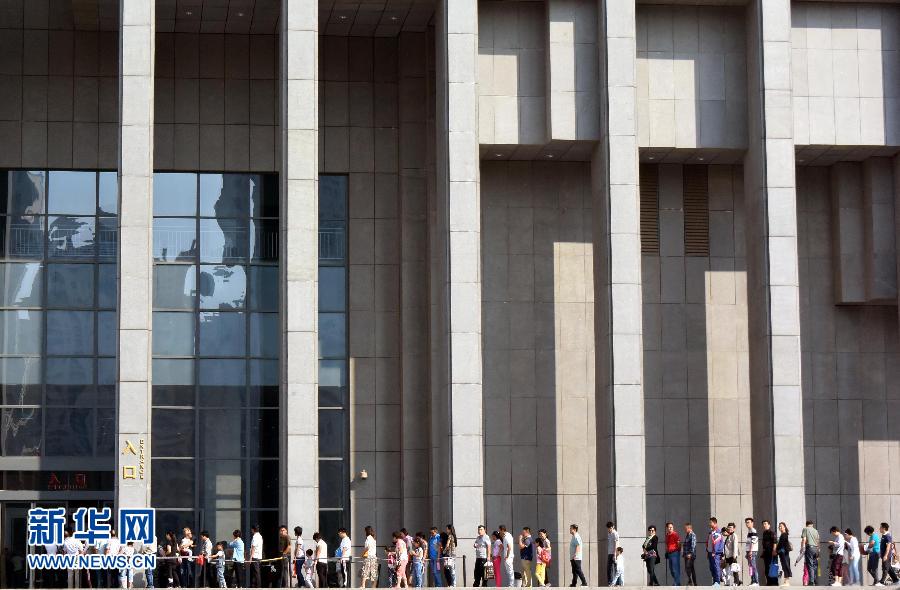 10月6日,众多参观者在山东省博物馆外排队等候。国庆长假期间,位于济南市的山东省博物馆专门推出了“非洲野生动物大迁徙”、鲁绣展、青铜器展等十多个专题展览,吸引众多游客前来参观游览。新华社记者 朱峥 摄
