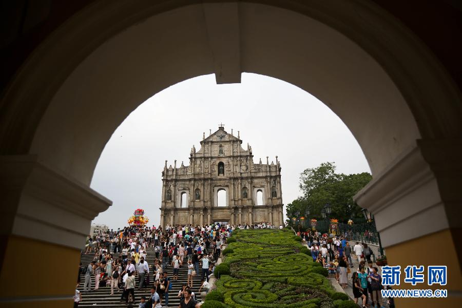 10月2日,游客在澳门大三巴牌坊游览。