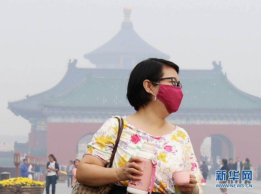 10月7日,一名游客带着口罩在北京天坛公园游玩。当日,北京继续遭遇重污染天气,空气污浊,能见度低,中央气象台继续发布霾黄色预警。 新华社发(王跃岭 摄)