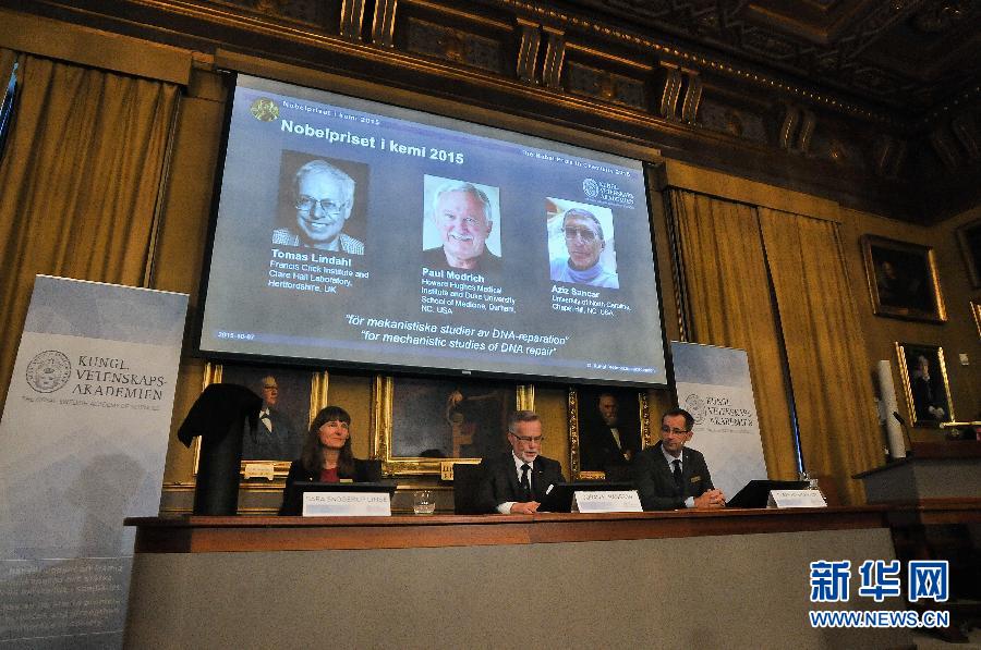 10月7日,瑞典皇家科学院常任秘书戈兰·汉松(中)等在斯德哥尔摩出席新闻发布会。瑞典皇家科学院当天宣布,将今年诺贝尔化学奖授予一名瑞典科学家、一名美国科学家和一名有美国和土耳其国籍的科学家,以表彰他们在基因修复方面的贡献。新华社发(罗布·顺巴姆摄)