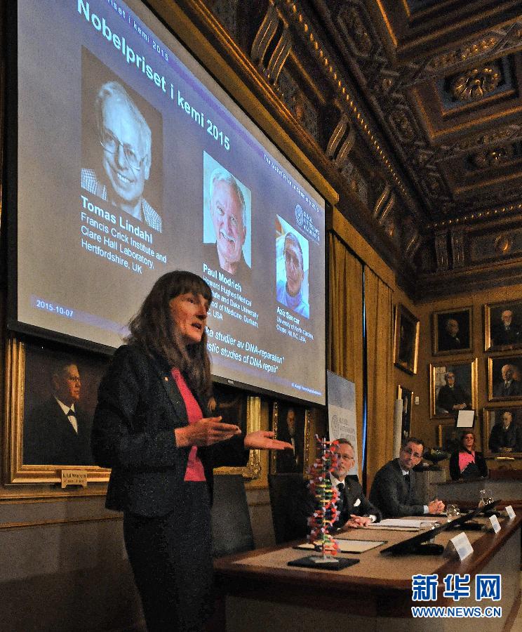 10月7日,在瑞典斯德哥尔摩,诺贝尔化学奖评委会主席萨拉·林瑟(左)在瑞典皇家科学院的新闻发布会上讲解获奖者的科研成果。瑞典皇家科学院当天宣布,将今年诺贝尔化学奖授予一名瑞典科学家、一名美国科学家和一名有美国和土耳其国籍的科学家,以表彰他们在基因修复方面的贡献。新华社发(罗布·顺巴姆摄)
