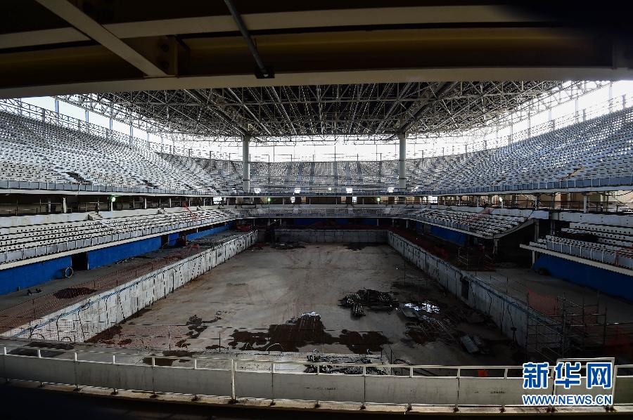 这是里约奥运会游泳中心的内景(10月6日摄)。第31届夏季奥林匹克运动会将于2016年8月5日-21日在巴西的里约热内卢举行,目前,众多场馆正在紧张地建设中。 新华社/法新