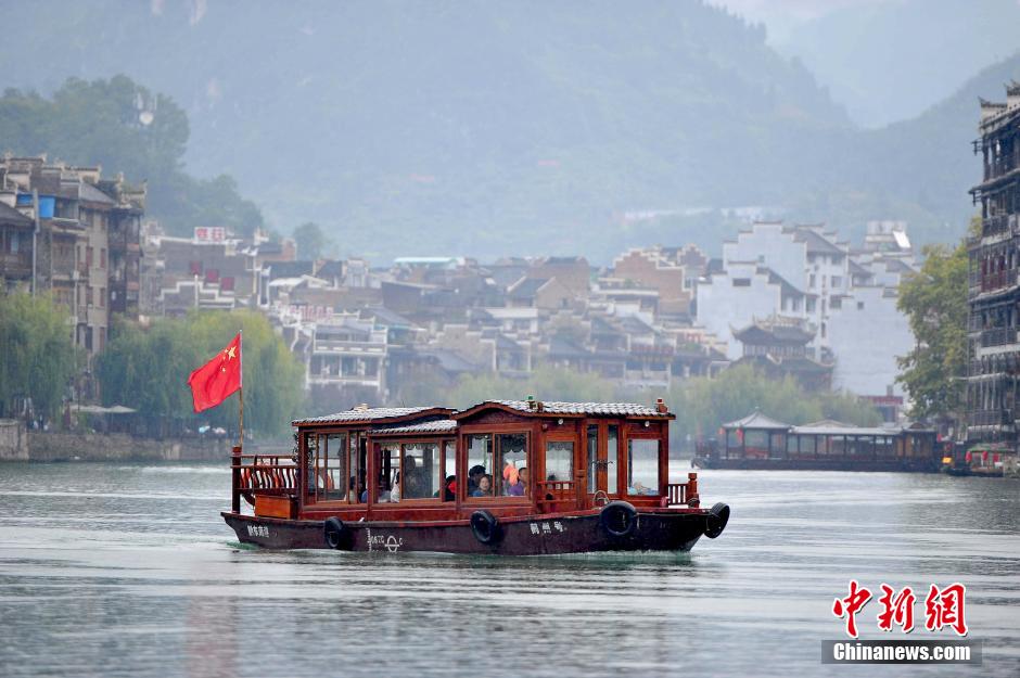10月5日,被中外游客誉为“东方威尼斯”的贵州镇远古城白墙黛瓦的徽派建筑甚是引人注目,吸引了许多游人前往观光。中新社记者 胡雁 摄
