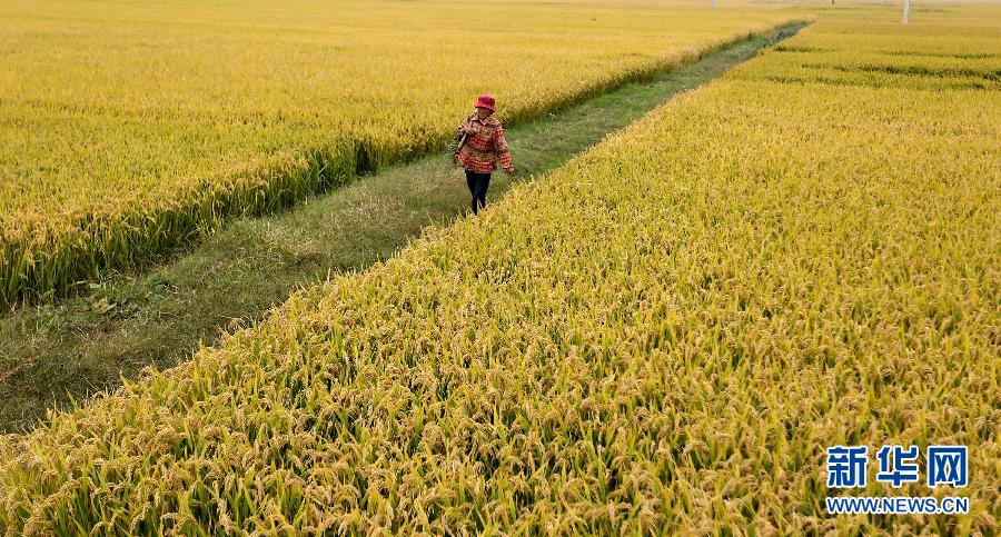 10月8日,在山东省郯城县郯城街道,一位农民在田间查看即将收割的水稻。 新华社发(张春雷 摄)