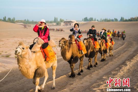 今年十一黄金周期间,游客骑着骆驼在敦煌大漠里自拍。 王斌银 摄