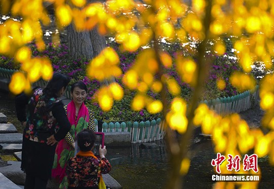 乌鲁木齐市水磨沟公园内,市民在满是金黄的树木下留影。 刘新 摄