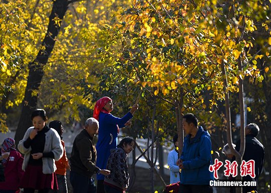 10月8日,新疆乌鲁木齐市水磨沟公园内金黄一片,市民穿梭其间,欣赏浓浓秋景。随着气温不断降低,乌鲁木齐市已进入深秋时节,道路两侧的树木已全部泛黄,并开始脱落,而市区各大公园内的景色月随着气温的降低,色彩由绿变黄,在阳光的照耀下,金黄一片。该市也将于10日,正式开始向民众供暖,驱赶寒意。