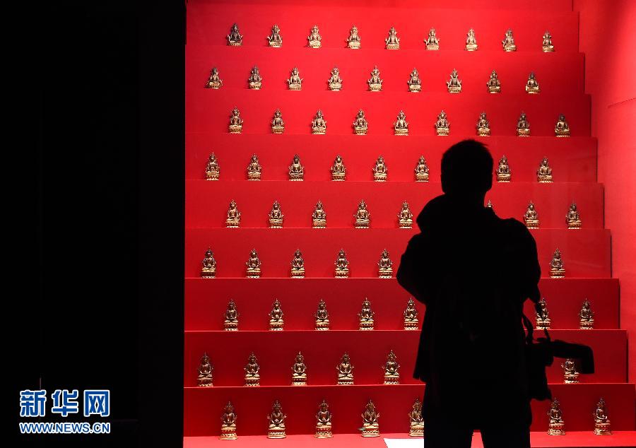 10月8日,一名记者在故宫雁翅楼“普天同庆——清代万寿盛典展”上拍摄铜九九无量寿佛。故宫博物院将于10月10日迎来成立九十周年院庆。届时,故宫博物院将正式对观众开放宝蕴楼、慈宁宫区域、午门-雁翅楼区域、东华门等四个新的区域,使故宫的开放面积由目前的52%增加至65%,带给观众更加完整丰富的参观体验。新华社记者金良快摄