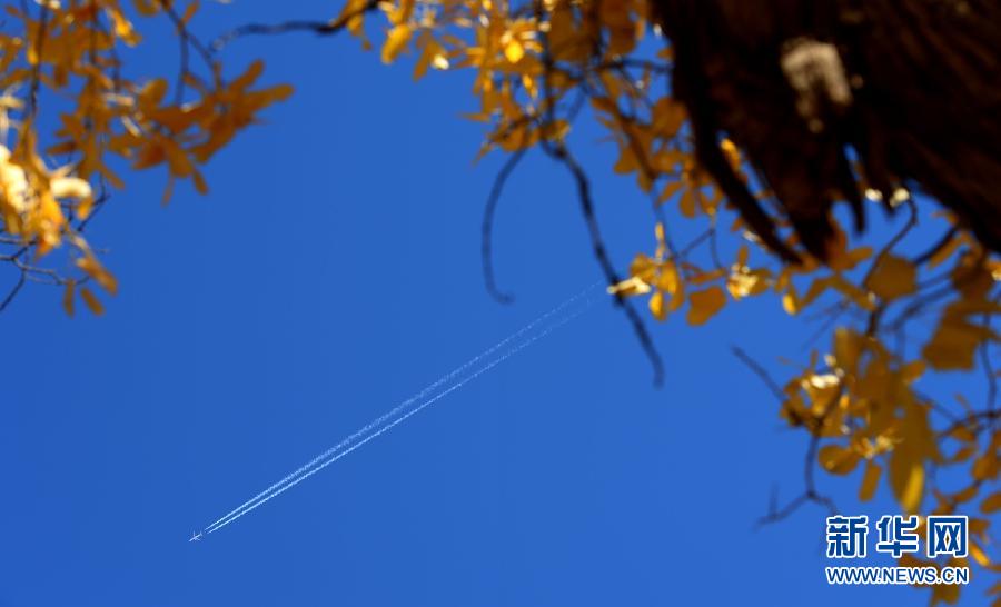 一架飞机从额济纳胡杨林上空飞过(10月8日摄)。内蒙古自治区额济纳旗胡杨林是世界上仅存的三大原始胡杨林之一,沿额济纳河的大面积胡杨美景吸引着大批游客。 新华社记者 赵鹏 摄