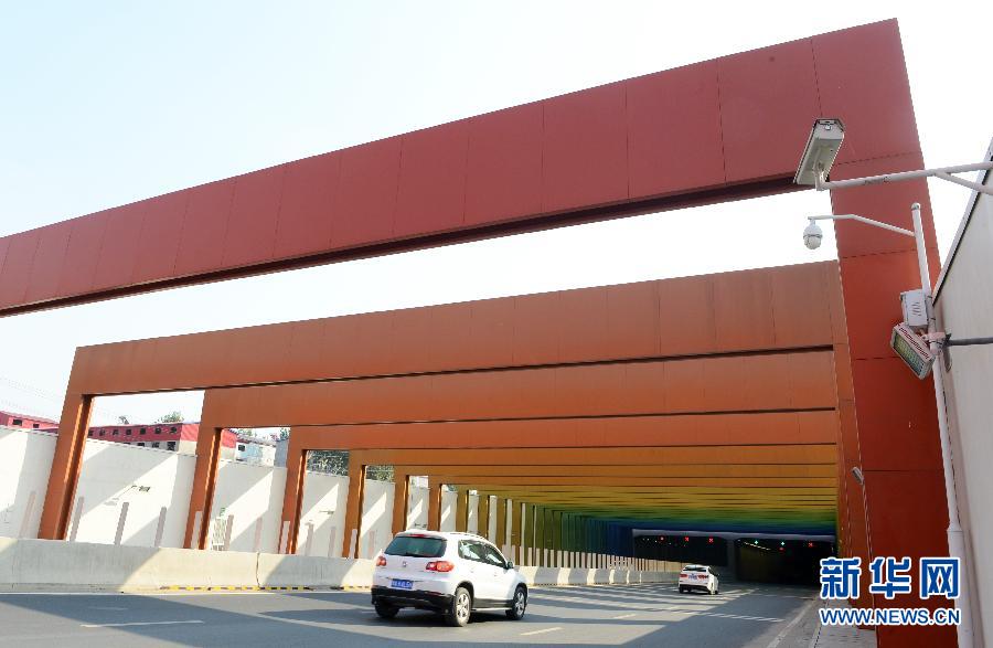 今年6月正式建成通车的郑开(郑州至开封)大道与S223省道交叉口北侧的一处“彩虹隧道”吸引了市民的关注。该隧道南北两端的引坡共安装了80余根彩色U形箱梁,箱梁分为12种不同色彩。据介绍,驾车通过隧道时,会形成“视觉渐变”的效果,在一定程度上可以缓解驾乘人员的视觉疲劳。新华社记者 朱祥 摄
