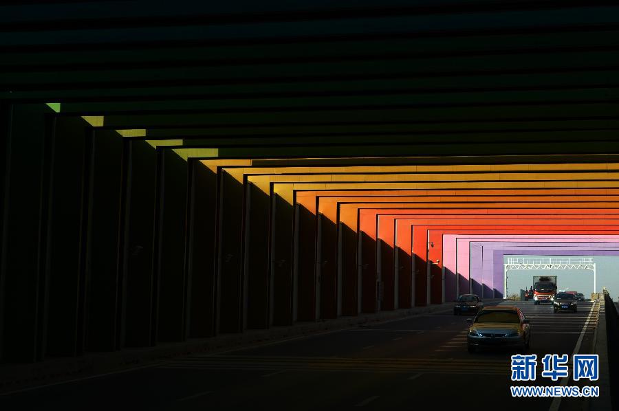 10月13日,车辆行驶在“彩虹隧道”。新华社记者 朱祥 摄