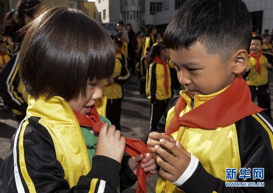 10月13日,新疆教育学院实验小学刚刚入队的一年级学生在系红领巾。 新华社记者王菲摄