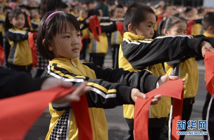 10月13日,新疆教育学院实验小学的一年级学生准备戴上红领巾。新华社记者王菲摄