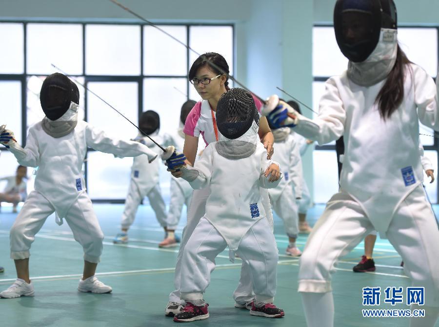 图为2015年10月9日,在福建省福州市梅峰小学,老师在给二年级学生翁岩一(右二)纠正击剑动作。击剑是该校特色体育项目。新华社记者宋为伟摄