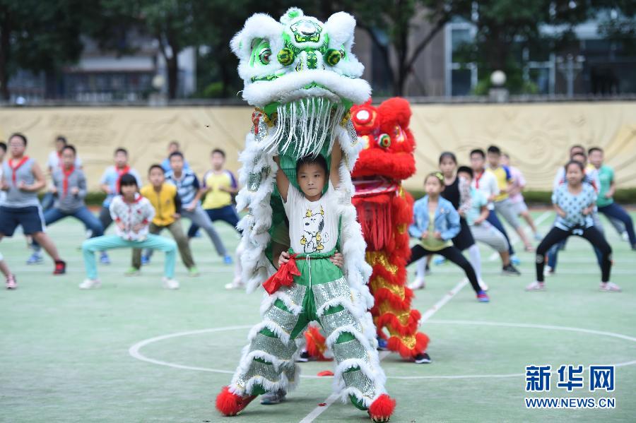 图为2015年10月9日,在福建省福州市钱塘小学屏北分校,六年级学生朱继胜(前)在练习舞狮,后排是该校舞狮队预备队员在练习基本功。舞狮和武术是该校的特色体育项目。新华社记者宋为伟摄
