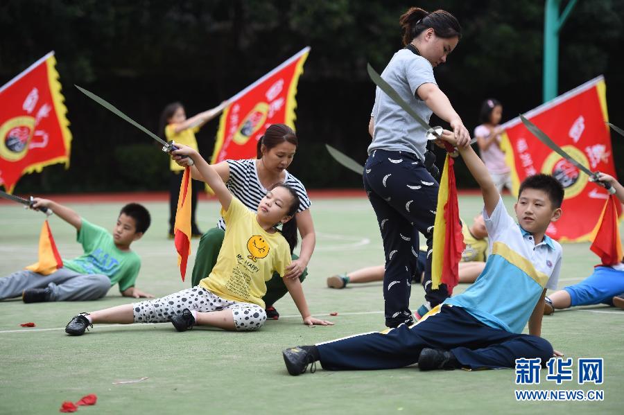 图为2015年10月9日,在福建省福州市钱塘小学屏北分校,教练为武术队学生传授自然门刀法套路。武术和舞狮是该校特色体育项目。新华社记者宋为伟摄