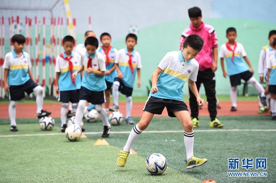 图为2015年10月10日,在福建省福州市融侨小学,四年级学生林子博(前)在练习带球。足球是该校特色体育项目。 新华社记者宋为伟摄