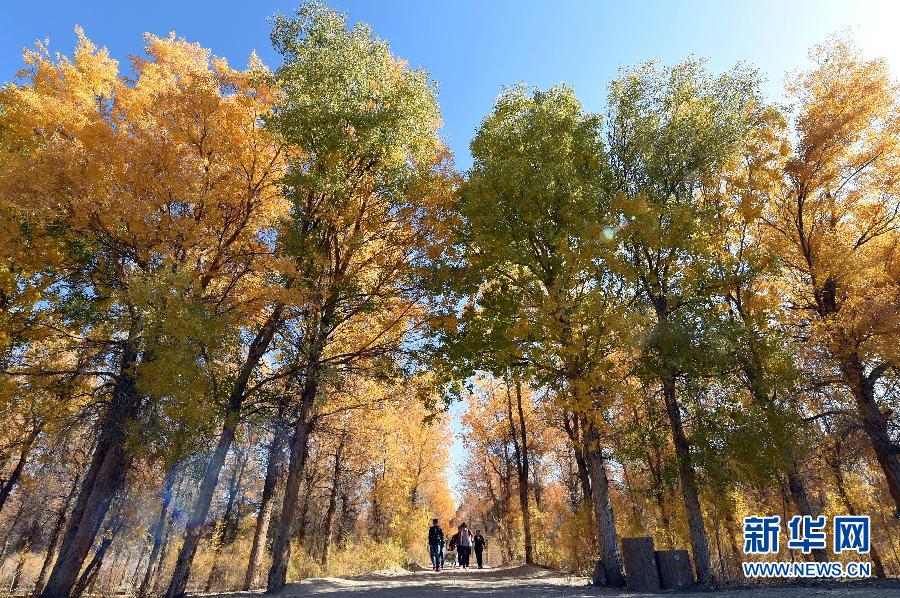 10月13日,游客在金塔县城以西巴丹吉林沙漠边缘的胡杨林参观游玩。新华社记者 范培珅 摄