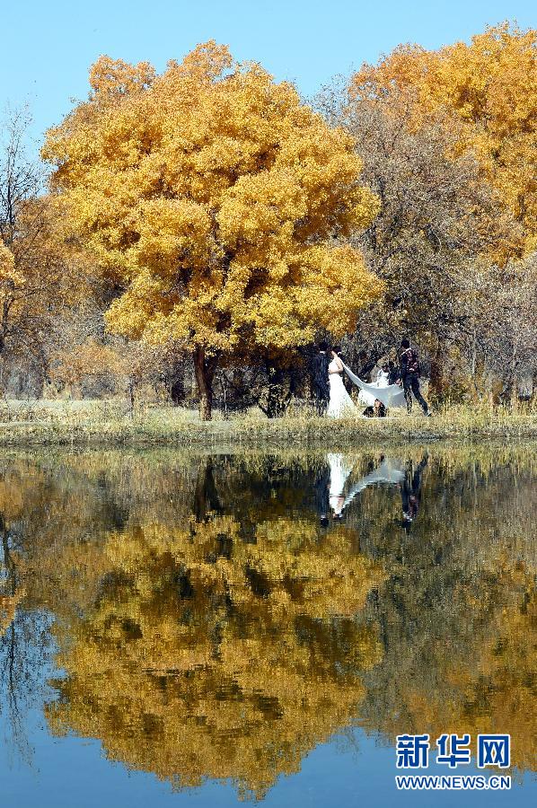 10月13日,一对新人在金塔县城以西巴丹吉林沙漠边缘的胡杨林拍摄婚纱照。新华社记者 范培珅 摄