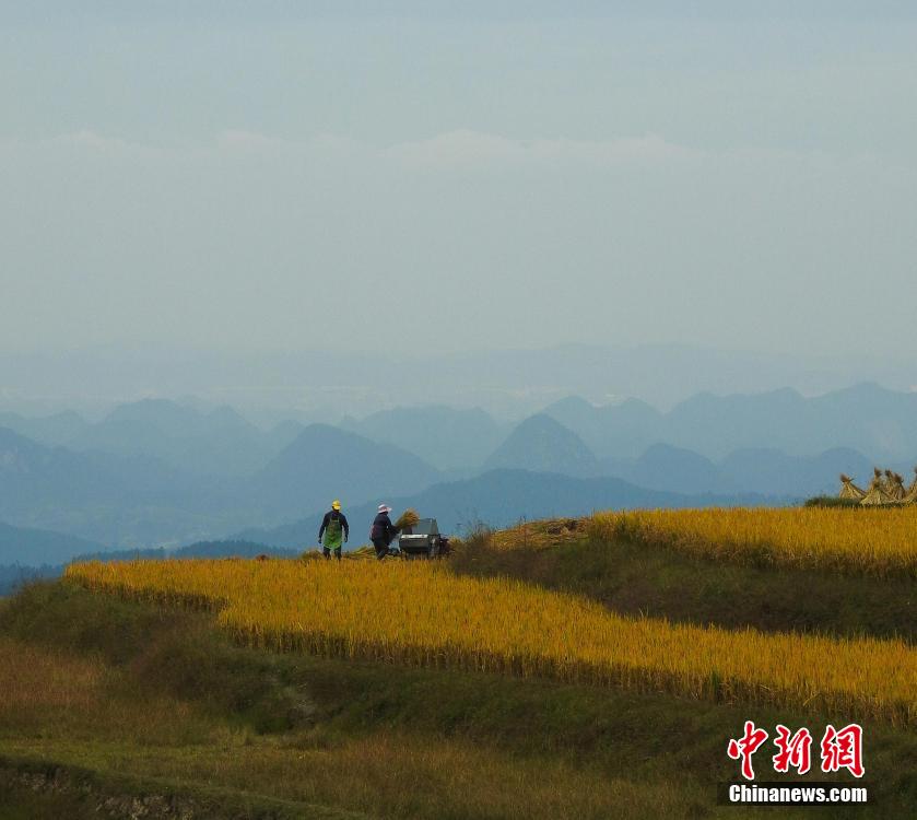 10月13日,贵阳市花溪区高坡乡进入丰收的季节。高坡苗族乡,居住有汉、苗、布依等民族,不仅淳朴民风,自然风光更是优美无比。一片片金黄的田野,就像一块块画布,装点着高坡大地。秋收时节,苗族同胞享受着丰收的喜悦。 中新社记者 张晖 摄