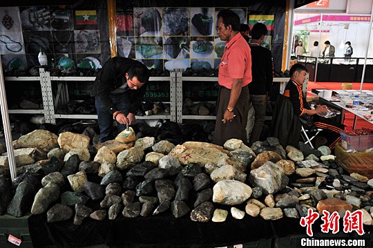 10月15日,第五届中国云南昆明国际珠宝展在昆明开幕,许多缅甸商人带着各色翡翠参展,吸引民众挑选购买。