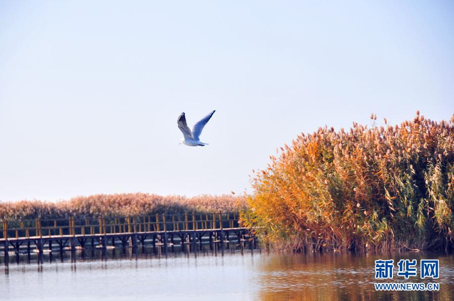 乌梁素海深秋美景(10月14日摄)。金秋十月,位于内蒙古自治区巴彦淖尔市乌拉特前旗境内的乌梁素海芦苇荡漾,候鸟纷飞,组成了一幅秋色美景。 新华社记者 邓华 摄