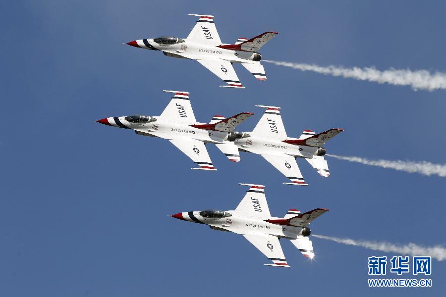 10月17日,美国空军“雷鸟”飞行表演队在美国休斯敦举办的航空展上表演。当日,第31届“天翼掠过休斯敦”航空展在美国得克萨斯州第一大城市休斯敦的埃灵顿机场拉开帷幕。 新华社发(宋穹摄)