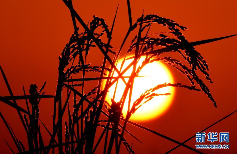 10月18日,在内蒙古呼和浩特市土默特左旗小丹巴村,饱满的稻穗迎接初升的太阳。秋高气爽时节,在呼和浩特土默特左旗小丹巴村,盐碱地经过技术改良而发展的稻田叠穗流金,稻穗在朝阳、晨光、星空、露珠的装扮下,映射出迷人的丰收景象。 新华社发(王正 摄)