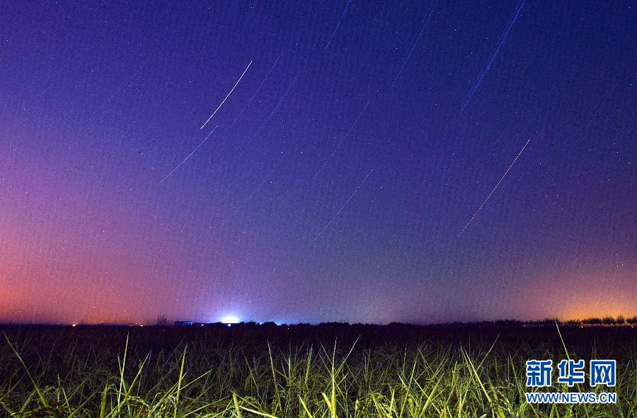 10月18日,在内蒙古呼和浩特市土默特左旗小丹巴村,星星在稻田上空留下美丽的轨迹。秋高气爽时节,在呼和浩特土默特左旗小丹巴村,盐碱地经过技术改良而发展的稻田叠穗流金,稻穗在朝阳、晨光、星空、露珠的装扮下,映射出迷人的丰收景象。 新华社发(王正 摄)