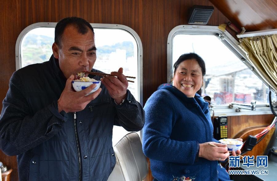 这是宁德市福安市下白石镇下岐村船民陈玉坤(左)和他的妻子在轮船上吃饭,陈玉坤在当地海洋渔业局开船,月收入3000多元(3月25日摄)。闽东沿海白马港,群山包围中的海岸线绵延不断,面海而建的楼房星罗棋布,海湾内船只穿梭往来,养殖海鲜的网箱星星点点,勾画出一幅美丽的海上渔耕图。如今,在福建省宁德市福安市下白石镇下岐村,2310名曾经长年漂在海上被称为“海上吉普赛人”的“连家船民”,告别了“风雨飘摇”,过上了“安居乐业”新生活。新华社记者魏培全摄