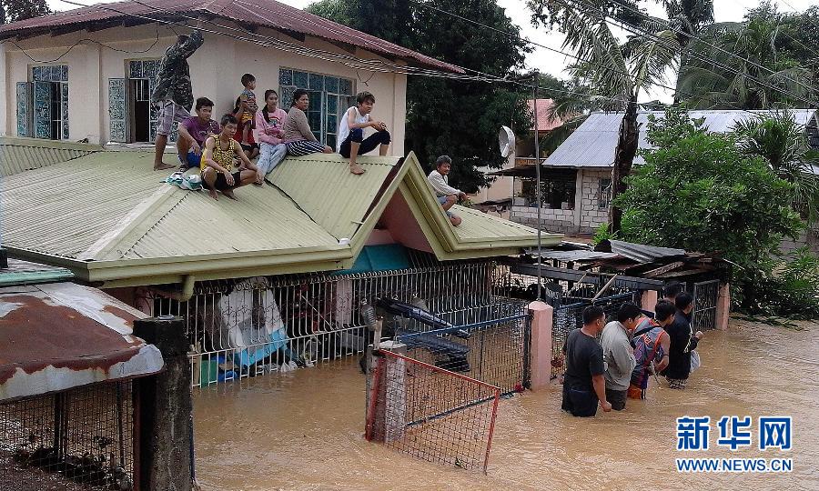 10月19日,在菲律宾北部的新怡诗夏省,居民坐在被洪水包围的屋顶上。台风“巨爵”(当地名:兰多)于18日凌晨1时许登陆菲东北部奥罗拉省。据菲律宾国家减灾委员会的消息,截至当地时间19日12时,此次台风已造成2人死亡,5人受伤。台风带来的强降雨致使新怡诗夏省和奥罗拉省部分地区洪水泛滥。新华社发