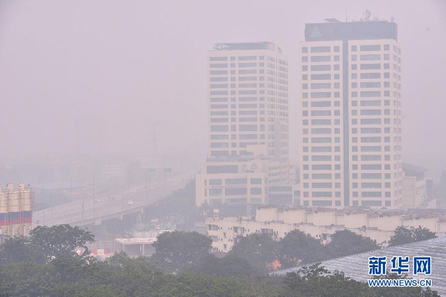 10月19日,在马来西亚吉隆坡,建筑物笼罩在烟霾之中。当日,烟霾再袭马来西亚。截至当地时间下午4点,马来西亚共有20个地区的空气污染指数达不健康水平。 新华社发(张纹综摄)