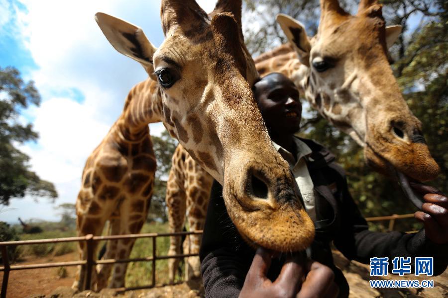 10月20日,在肯尼亚内罗毕的长颈鹿保护中心,长颈鹿与工作人员嬉戏。在肯尼亚首都内罗毕有一座始建于1979年的长颈鹿保护中心。游客在保护中心可以亲手抚摸长颈鹿,给长颈鹿喂食,甚至可以被长颈鹿“亲吻”。创办者希望通过让游客亲自喂养和与长颈鹿亲密接触的行为,帮助人们理解人与自然和睦相处及保护野生动物的重要性。新华社记者潘思危摄