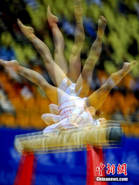 10月20日,中国首届青运会女子平衡木比赛在福州海峡奥体中心体育馆举行,记者用多重曝光模式拍摄的平衡木比赛让人产生梦幻感觉。 王东明 摄