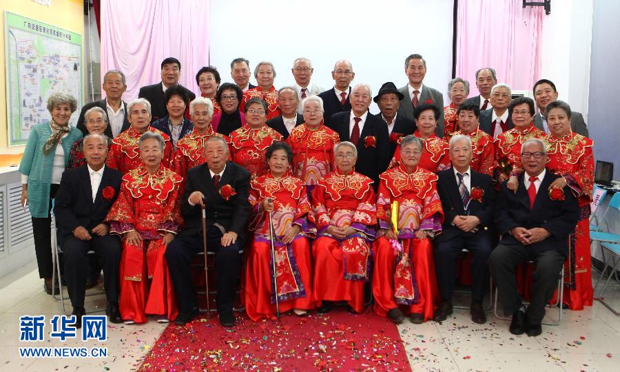 10月20日,参加金婚庆典活动的15对老人与社区工作者和居民共同合影。重阳佳节即将到来之际,北京广内街道核桃园社区为辖区内老人举办主题为“爱如蝶环绕,牵手五十年”的金婚庆典活动。15对结婚50年以上的夫妇携手走上红毯,向到场居民们讲述了他们相濡以沫的爱情故事。新华社发(崔进勇 摄)