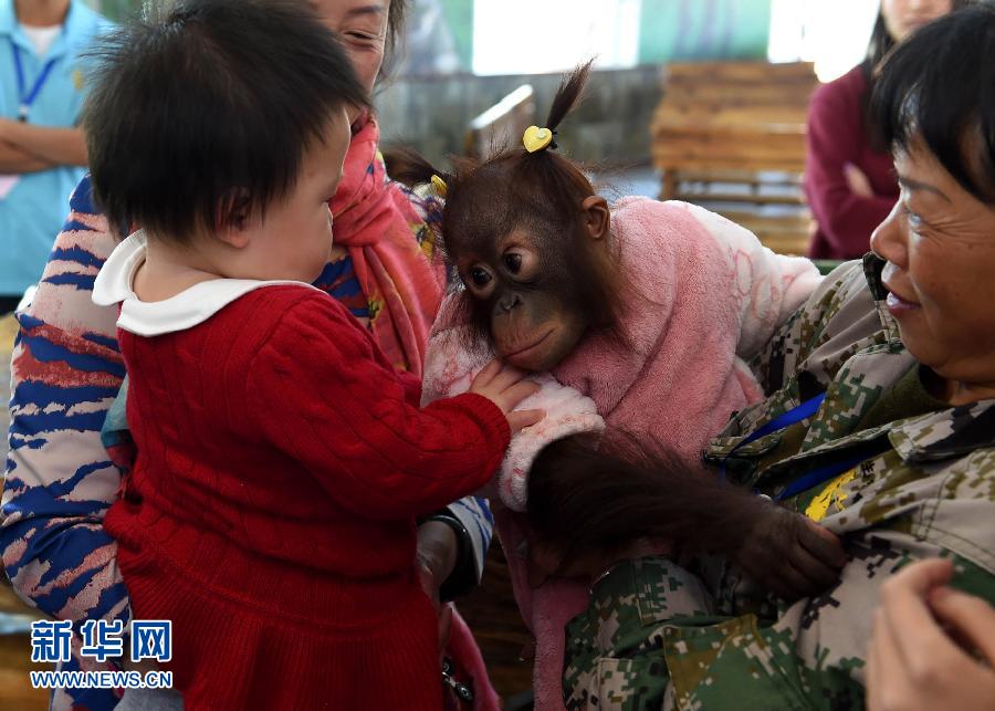 10月20日,一名不到两岁的小女孩在云南野生动物园里和一只两岁大的红毛猩猩玩耍。近日,云南省昆明市天气晴好,阳光明媚,云南野生动物园里的动物们纷纷来到户外活动筋骨。 新华社记者 蔺以光 摄