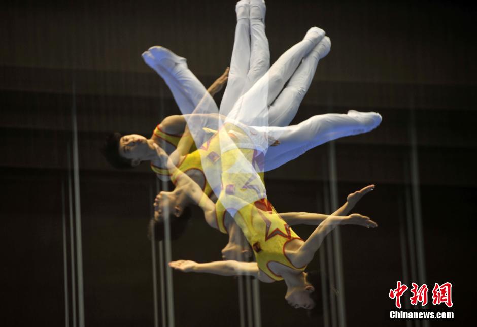 10月21日,中国首届青运会男子网上蹦床决赛在福建师范大学体育中心举行,记者用多重曝光模式拍摄选手在空中的旋转动作。吕明 摄