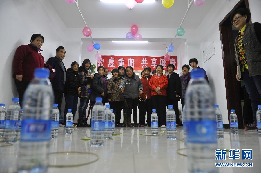 10月21日,三河市富贵园社区的老人们在参加“欢度重阳共享健康”社区趣味运动会。 当日是重阳节,河北省三河市众多社区分别开展丰富多彩的联欢庆祝活动,社区老人们欢聚一堂,共度重阳佳节。新华社记者鲁鹏摄