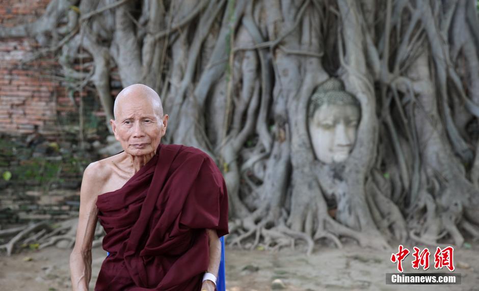 图为10月21日,一位僧人在大城帕拉玛哈泰寺“树抱佛”古迹前拍照留念。符永康 摄