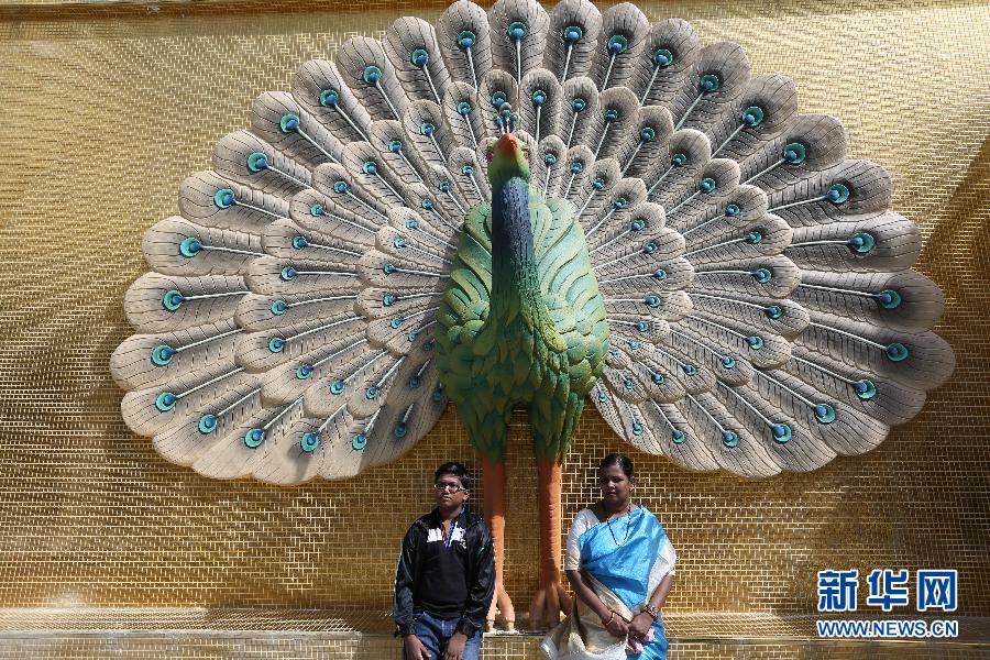 10月22日,在不丹最大佛像的塔基楼外,一对来自印度的母子在壁画前合影留念。不丹最大佛像高50多米,位于首都廷布以南约两公里,佛像塔基楼内藏有逾10万尊小佛像。 新华社记者周盛平摄