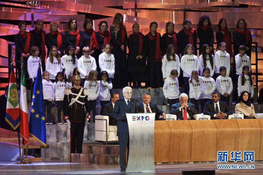 10月31日,在意大利米兰举行的世博会闭幕式上,意大利总统马塔雷拉致辞。当日,历时半年的2015年米兰世博会10月31日落下帷幕。6个月中,超过2150万名来自世界各地的参观者体验了这场以“滋养地球,生命能源”为主题的盛会。 新华社记者金宇摄