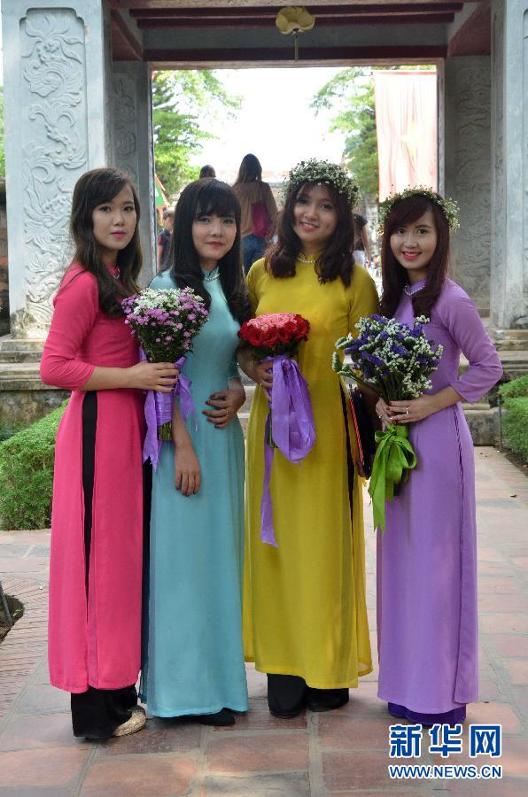 11月1日,在越南首都河内,身着奥黛的女学生拍照留念。 “奥黛”是越南的国服,又称为越南“长衫”,分为男版和女版,女性身着奥黛更为普遍。奥黛通常使用丝绸等软性布料,上衣是一件长衫,两侧开叉至腰部,下半身配上一条喇叭筒的长裤。当地人一般在婚嫁、重大节日、外交和会客等正式场合穿着奥黛。新华社记者闫建华摄