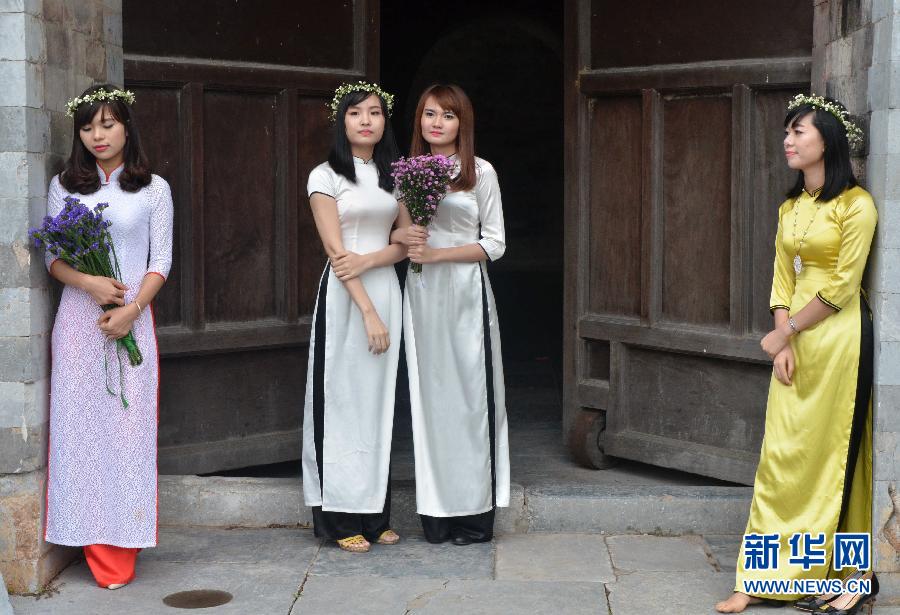 11月1日,在越南首都河内,身着奥黛的女学生拍照留念。 “奥黛”是越南的国服,又称为越南“长衫”,分为男版和女版,女性身着奥黛更为普遍。奥黛通常使用丝绸等软性布料,上衣是一件长衫,两侧开叉至腰部,下半身配上一条喇叭筒的长裤。当地人一般在婚嫁、重大节日、外交和会客等正式场合穿着奥黛。新华社记者闫建华摄