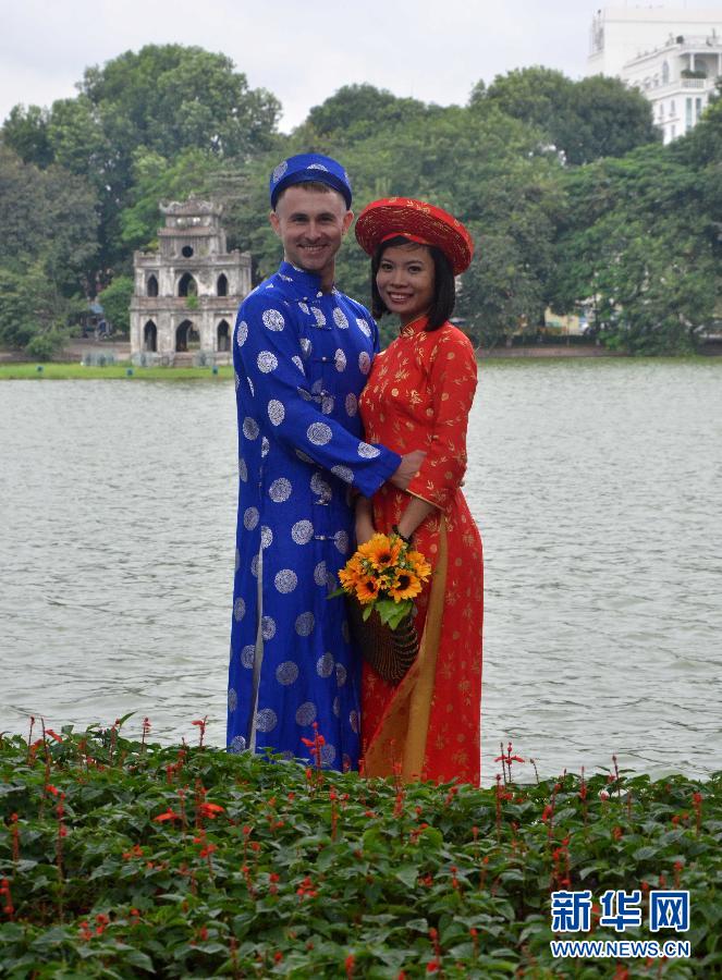 11月1日,在越南首都河内,一对身着奥黛的情侣在拍婚纱照。 “奥黛”是越南的国服,又称为越南“长衫”,分为男版和女版,女性身着奥黛更为普遍。奥黛通常使用丝绸等软性布料,上衣是一件长衫,两侧开叉至腰部,下半身配上一条喇叭筒的长裤。当地人一般在婚嫁、重大节日、外交和会客等正式场合穿着奥黛。新华社记者闫建华摄
