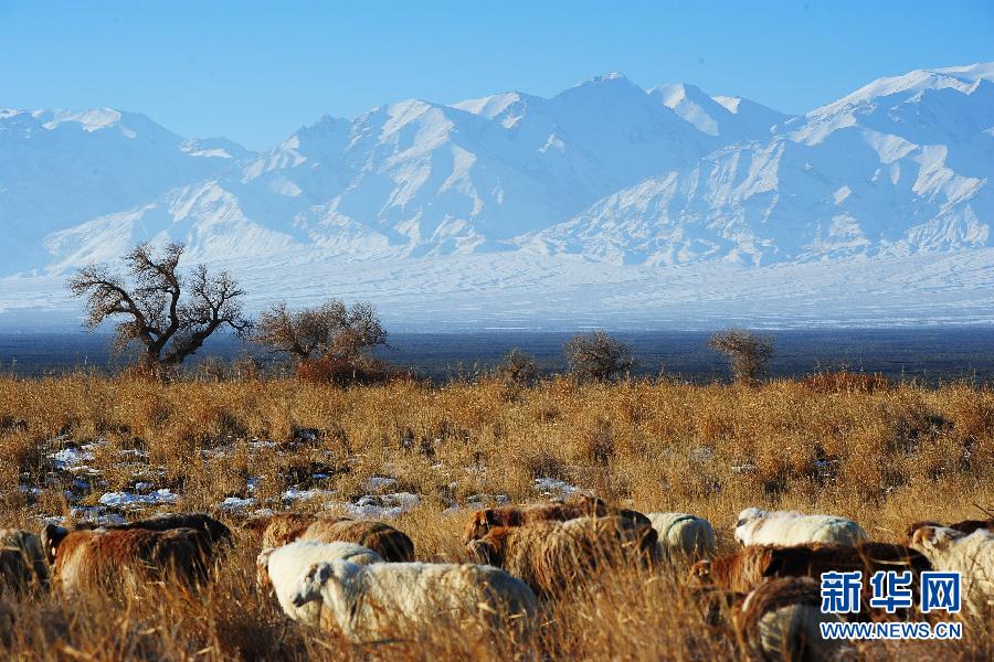 11月2日,羊群在新疆哈密东天山下觅食。眼下,新疆哈密东天山披上银装,绵延数百里的松涛林海在暖阳的映照下绚丽多彩,分外娇娆。 新华社发(李华 摄)