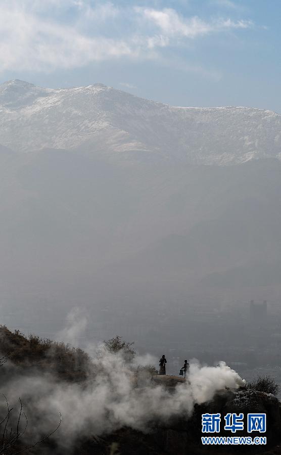 11月3日,藏族信徒在色拉寺后山上煨桑烟。