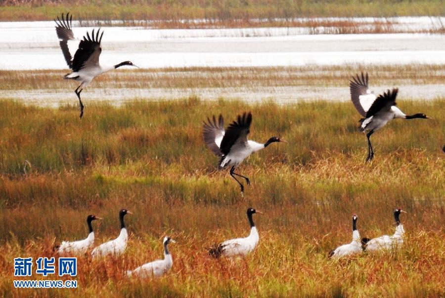 11月3日在贵州省草海国家级自然保护区胡叶林核心区拍摄的越冬黑颈鹤。近日来,位于贵州省毕节市威宁县的草海国家级自然保护区迎来今年第一批越冬候鸟,为深秋的草海湿地平添些许生趣。草海是海拔2000米以上的淡水湖泊,是以高原湿地生态系统及其珍稀鸟类为主要保护对象的综合性自然保护区,每年有包括国家一级保护物种黑颈鹤在内的200多种鸟类在此过冬。新华社发(杨文斌 摄)