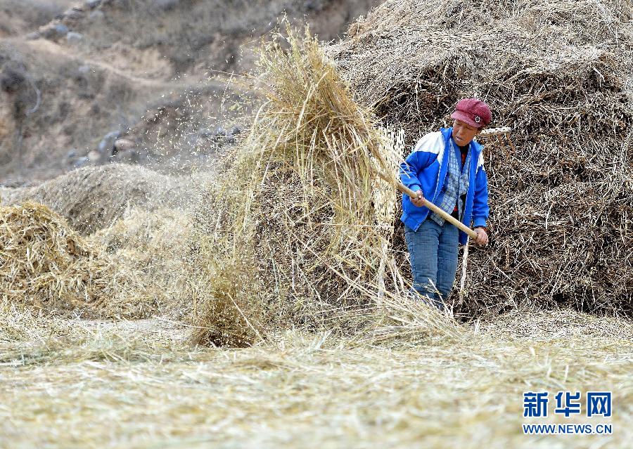 11月3日,和林格尔县黑老夭乡昆都仑村一名村民在打场碾压莜麦。