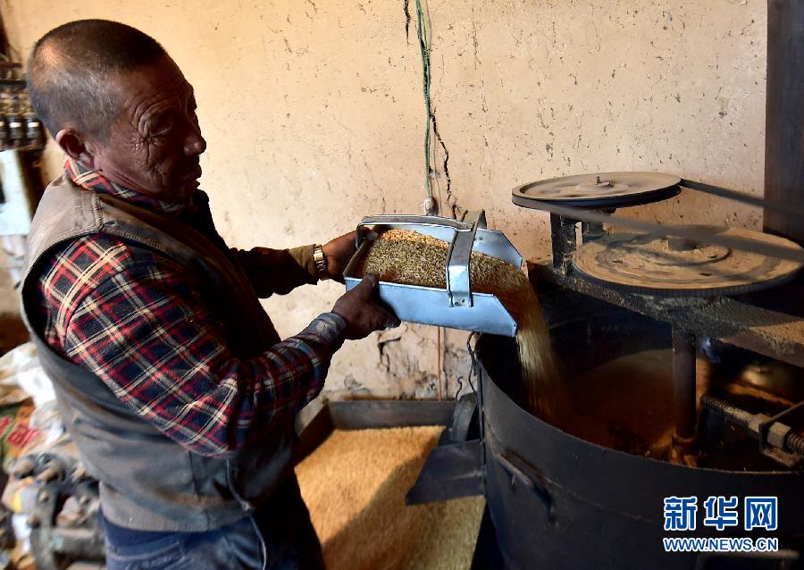 11月3日,和林格尔县黑老夭乡昆都仑村村民廉元腾在炒莜麦。新华社记者 任军川 摄