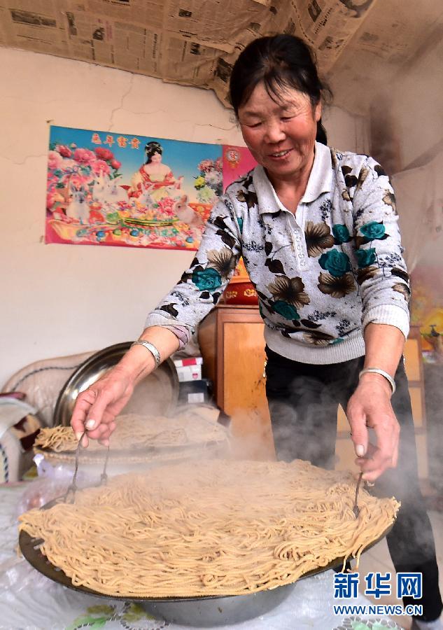 11月3日,和林格尔县黑老夭乡昆都仑村村民张明枝在将蒸熟的莜面端出锅。新华社记者 任军川 摄